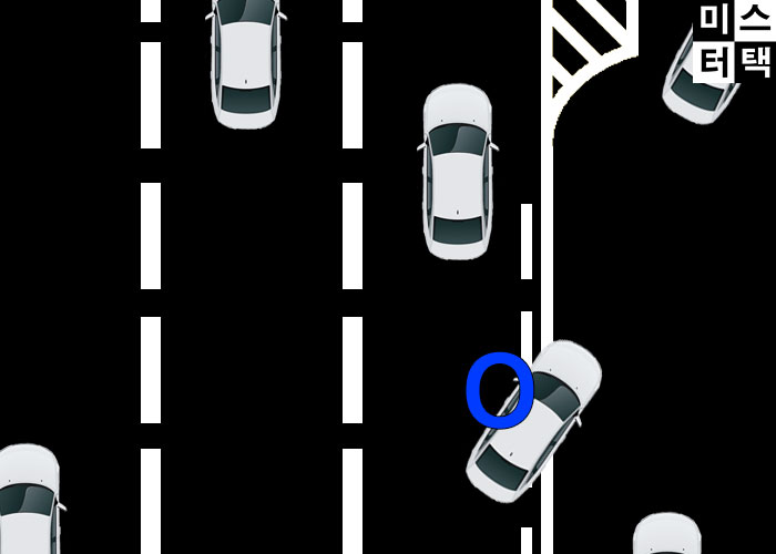 위 그림처럼 정체가 되어 차량들이 정지 혹은 서행 중일 때 끼어드는 것은 불법입니다.