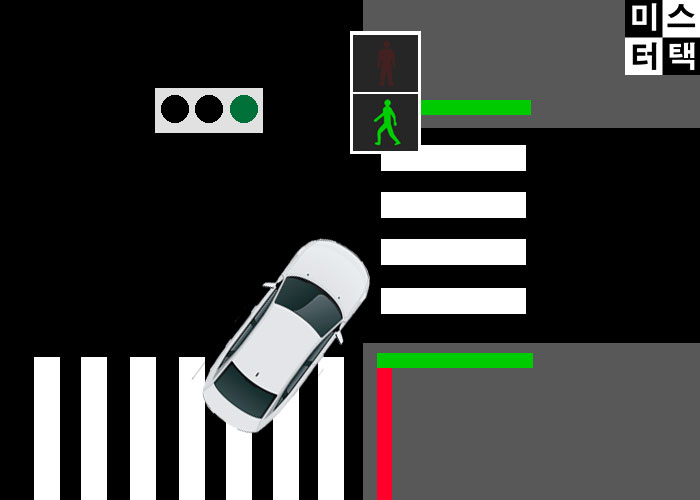 두 번째 상황은 우회전 후 횡단보도입니다. 우회전 후 횡단보도에 보행자 신호가 녹색불이라도 보행자가 없는 경우 서행하여 통과할 수 있습니다. 단, 보행자가 있는데 통과했을 경우 신호위반입니다.