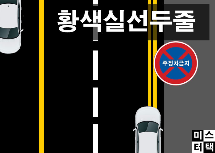 황색 실선이 두 줄 그어져 있다면 주정차 금지 구역으로 절대 주차도 정차도 하시면 안 됩니다. 차를 잠시 세웠을 때 사고가 날 위험이 큰 구역이기 때문입니다.