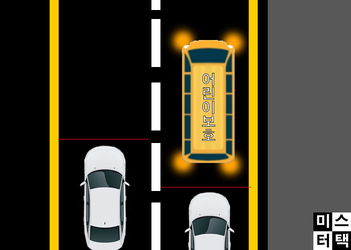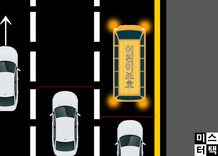 통학버스가 정차를 위해 비상등을 켜고 일시 정지할 때에는 뒤따라 가는 차와 옆 차선의 차도 비상등을 켜고 일시 정지해야 합니다. 이후 옆 차선의 차량은 서행하며 통학버스를 지나가면 됩니다.